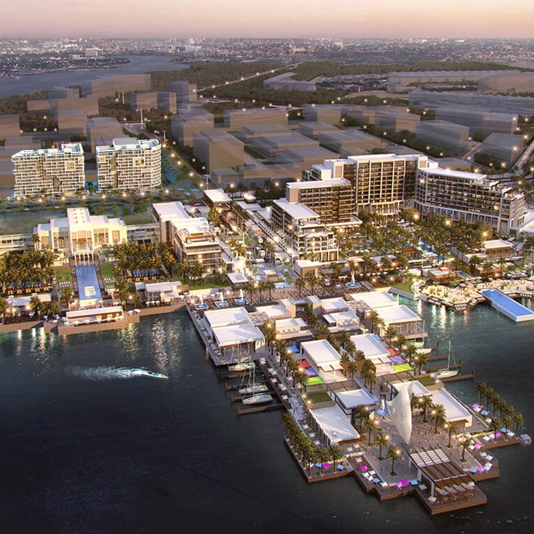 The Waterfront, vibrant leisure, and entertainment district, including The Hilton Hotel, cafés and restaurants, retail outlets, a boutique cinema, a beach club, and the award-winning Etihad Arena.