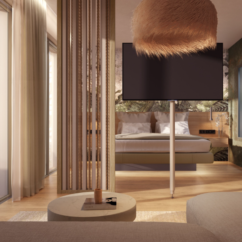 The design, inspired by renowned architect Jean-Pierre Heim, incorporates the “Olive Tree” style, symbolizing peace, longevity, and well-being, with modern and stylish interiors and exteriors.